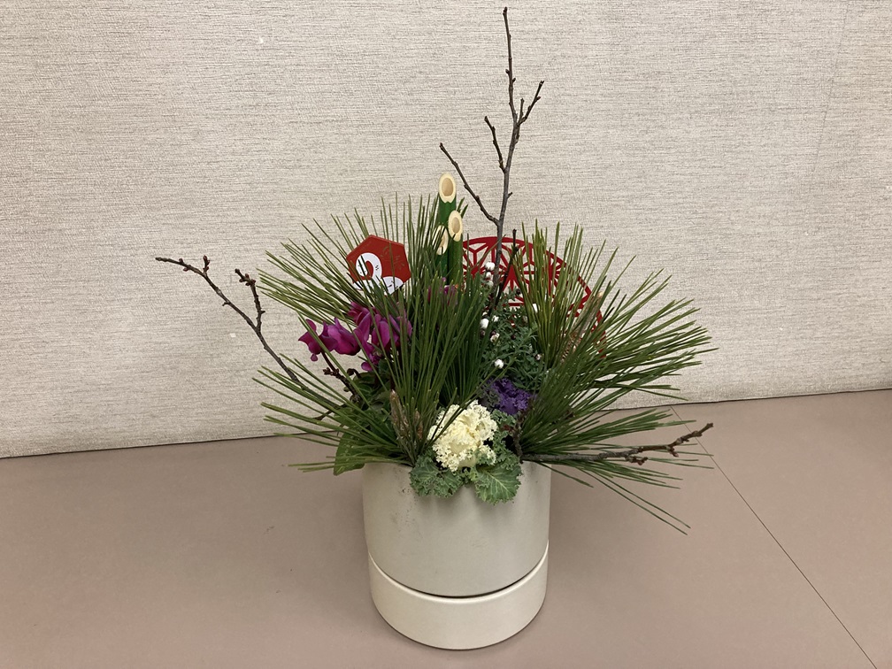 松や葉ボタンなどを組み合わせて、華やかで長く楽しめるアレンジを作ります。