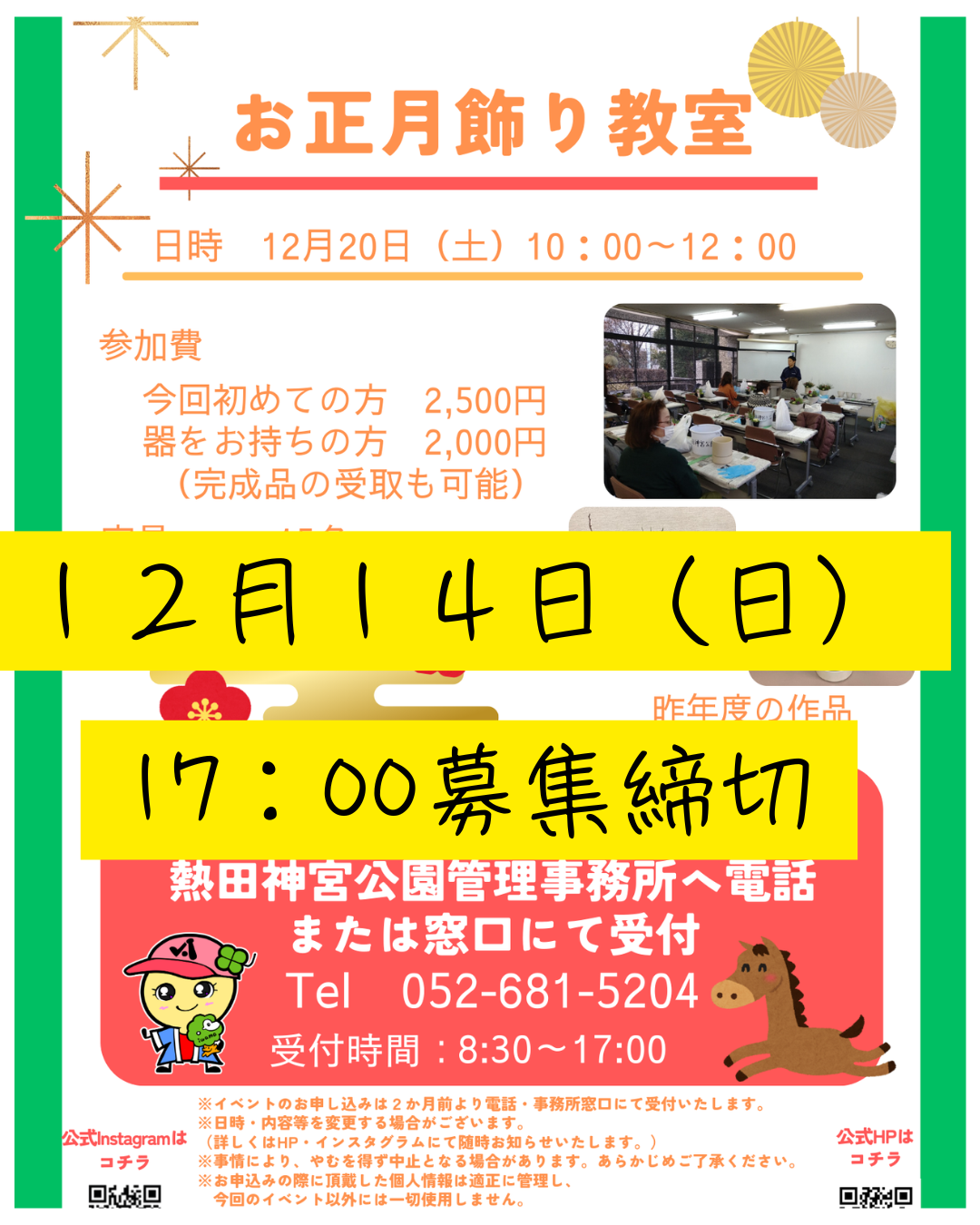 12月20日(土)開催予定のお正月飾り教室の参加申込みは、12月14日 (日)17:00 までの受付となります。